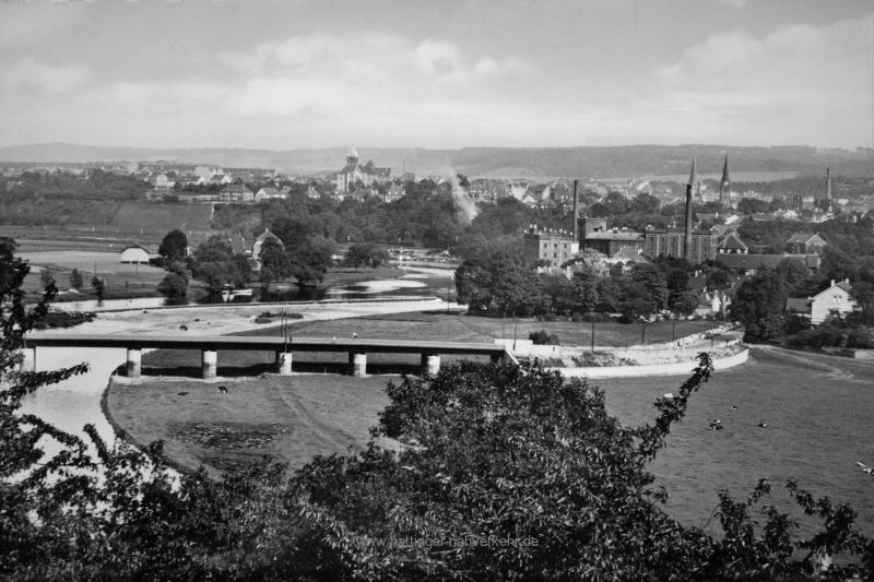 Vermutlich bereits in der Vorkriegszeit entstand das für dieses Kapitel verwendete Beitragsbild. Es zeigt die 1937 errichtete neue Ruhrbrücke (Verlag Cramers Kunstanstalt, Dortmund – Sammlung Ludwig Schönefeld). Trotz der eher dürftigen Druckqualität sind die erhöhten Pfeiler und die neu angelegte Rampe auf der Südseite der Brücke gut zu sehen.