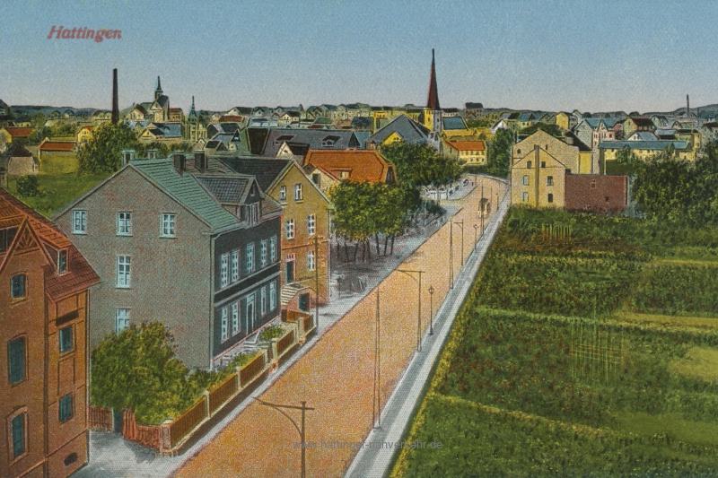 Das Beitragsbild zeigt die Trasse der Bergischen Kleinbahn auf der Südseite der Bruchstraße. Die in den 1920er-Jahren als Teil eines „Carnets“ angebotene Postkarte ist weit verbreitet. Unter Hattinger Heimatfreunden gibt es das Gerücht, am Hattinger Bahnhof sei der Verkaufsautomat mit den Postkartenheften während der Ruhrbesetzung geplündert worden. Deshalb gäbe es die farbige Postkarte bis heute besonders häufig.